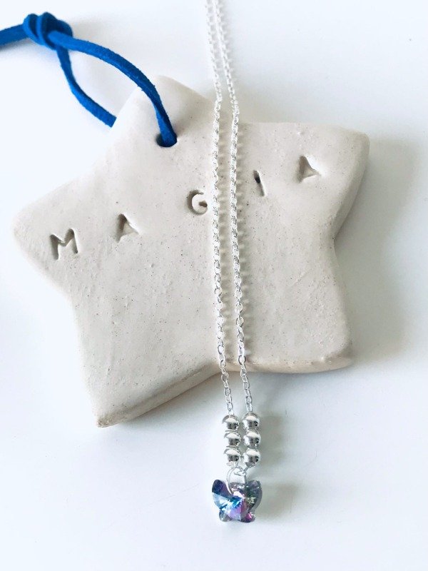 CADENA CON BOLITAS PLATEADAS MAS MARIPOSA ROSA TORNASOLADO