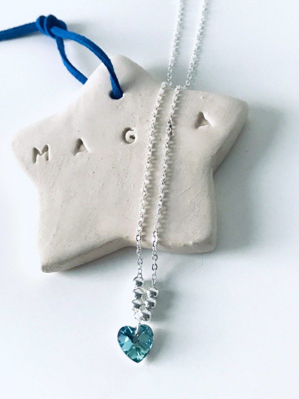 CADENA CON BOLITAS PLATEADAS MAS CORAZON CELESTE TORNASOLADO