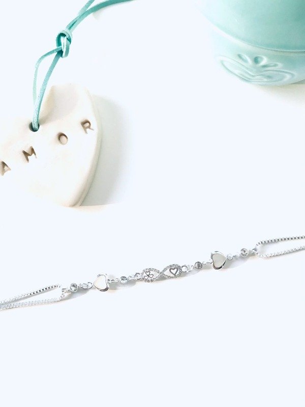 PULSERA CON CORAZONES BLANCOS, PIEDRAS E INFINITO CON STRASS