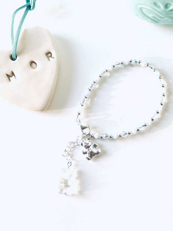 PULSERA CON PIEDRAS BLANCAS Y TRANSPARENTES MAS OSITO TRANSPARENTE Y PLATEADO