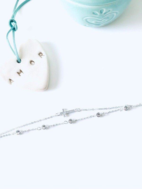 PULSERA DOBLE CADENA CON PIEDRAS BLANCAS Y CRUZ CON STRASS