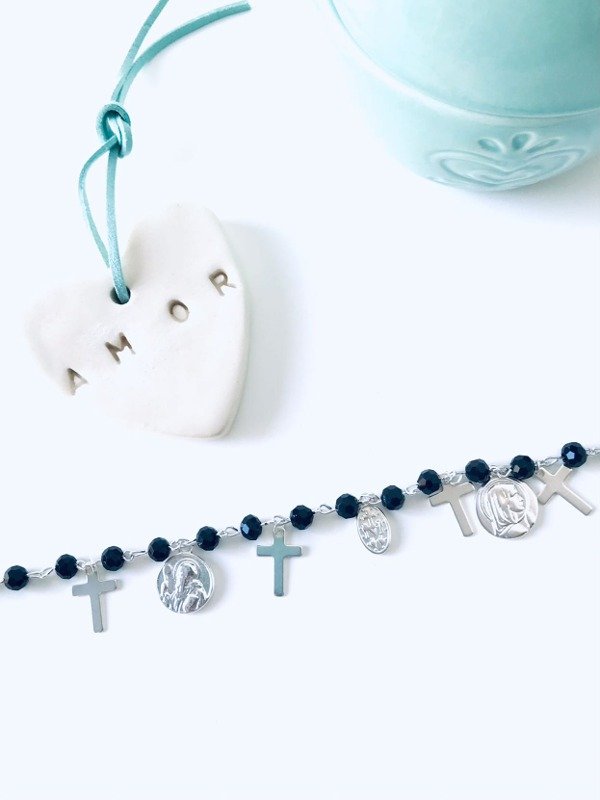 PULSERA CON BOLITAS NEGRAS, CRUCES Y DIJES SAN BENITO, VIRGEN NIÑA Y MEDALLA MILAGROSA