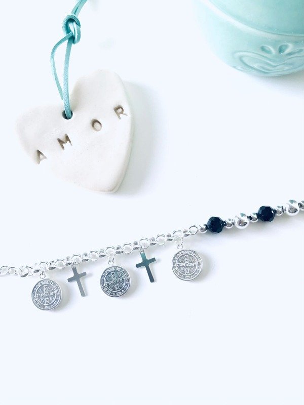 PULSERA BOLITAS NEGRAS CON DIJES DE CRUCES Y SAN BENITO