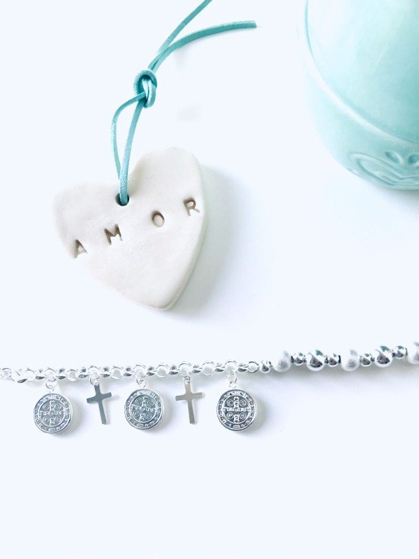 PULSERA BOLITAS PLATEADAS CON DIJES DE CRUCES Y SAN BENITO