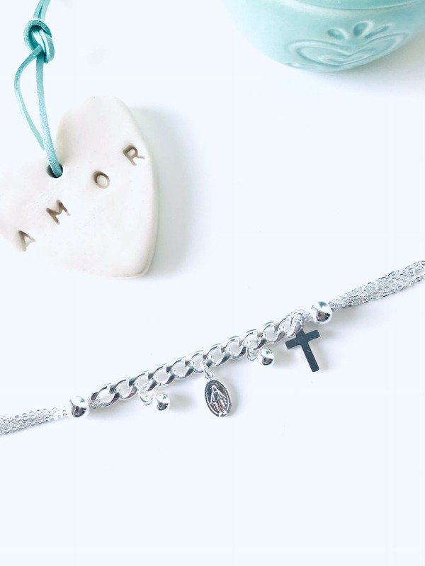 PULSERA MEDALLA MILAGROSA CON DETALLE DE CADENAS Y BOLITAS PLATEADAS