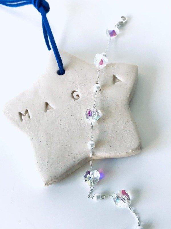 PULSERA MAS PERLITAS Y CORAZONES TORNASOLADOS