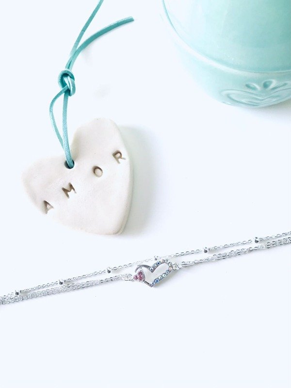 PULSERA CON CADENA TRIPLE, BOLITAS Y CORAZON CON PIEDRAS